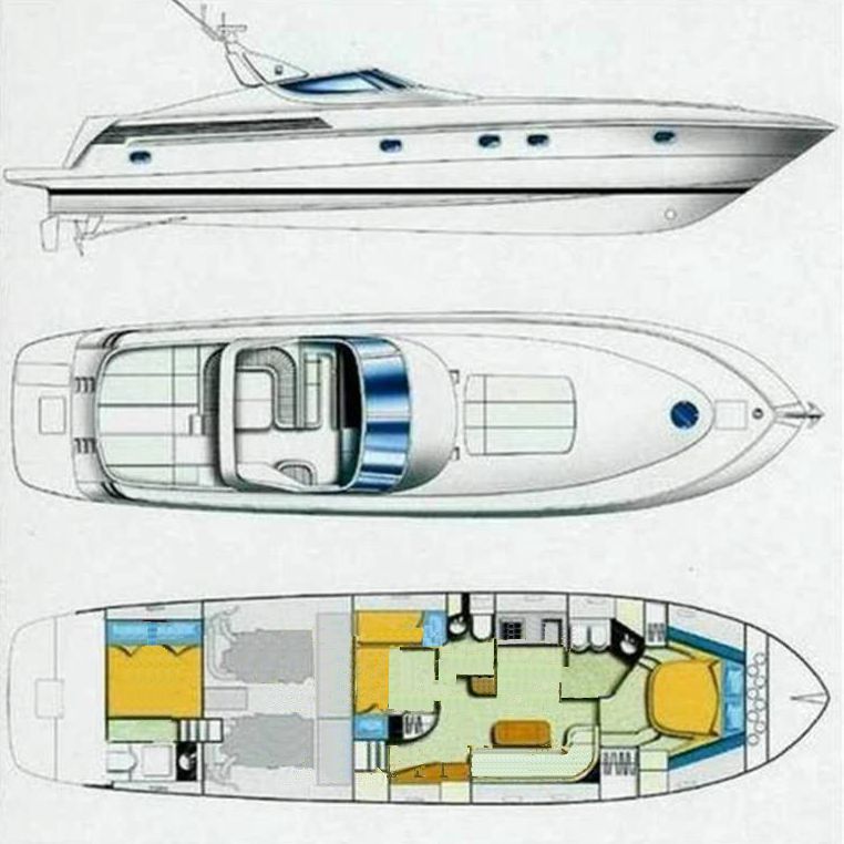 Cantiere, sono caratterizzati, oltre che dall’ampio salone con cucina, da tre vere e proprie suites indipendenti e da un alloggio per il marinaio a poppa.